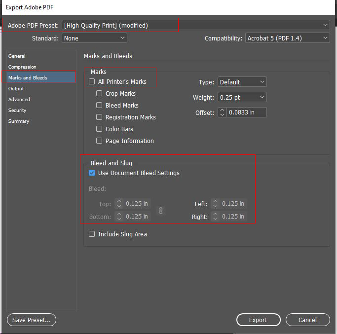 - Then on the left side click on Marks and Bleeds and uncheck All Printer’s Marks and check Bleeds Use Document Bleed Settings (make sure these are set to .125).