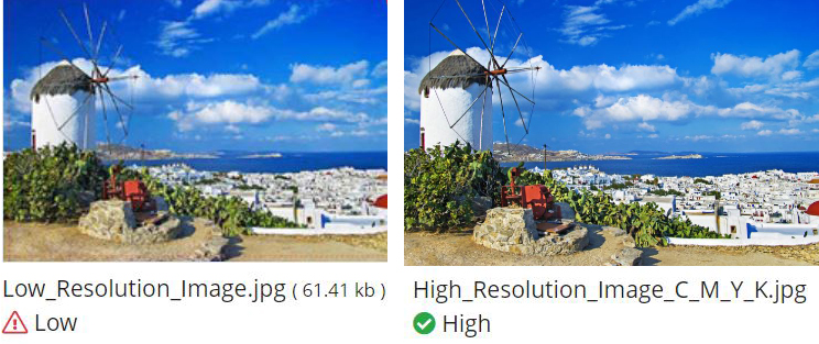 When you upload your file(s) on Printshop USA if any of your images are low resolution you will see a warning symbol (left picture). If your image is an acceptable (high) resolution you will see a green check-mark (right image).