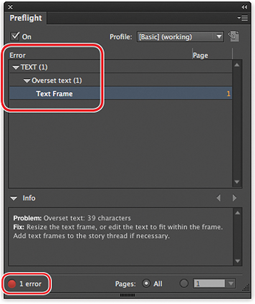 - When setting up your file use the InDesign Preflight feature to ensure an error free design. This feature is turned on by default and found at the bottom of the screen. Or choose Window > Output > Preflight to open the error panel. Below is an example of a text error.