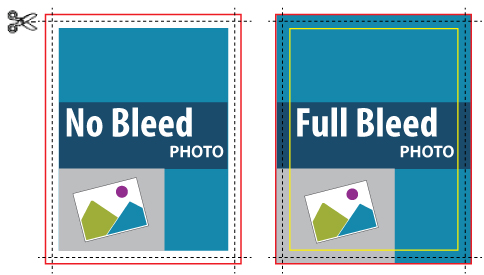 The image below shows the crop marks (cut line) as the dotted lines. On the left, the image has not been extended beyond the doted line so when the product is cut it will have a white border all the way around. On the right, the image extends beyond the crop marks so the image will "bleed" all the way off the page.
