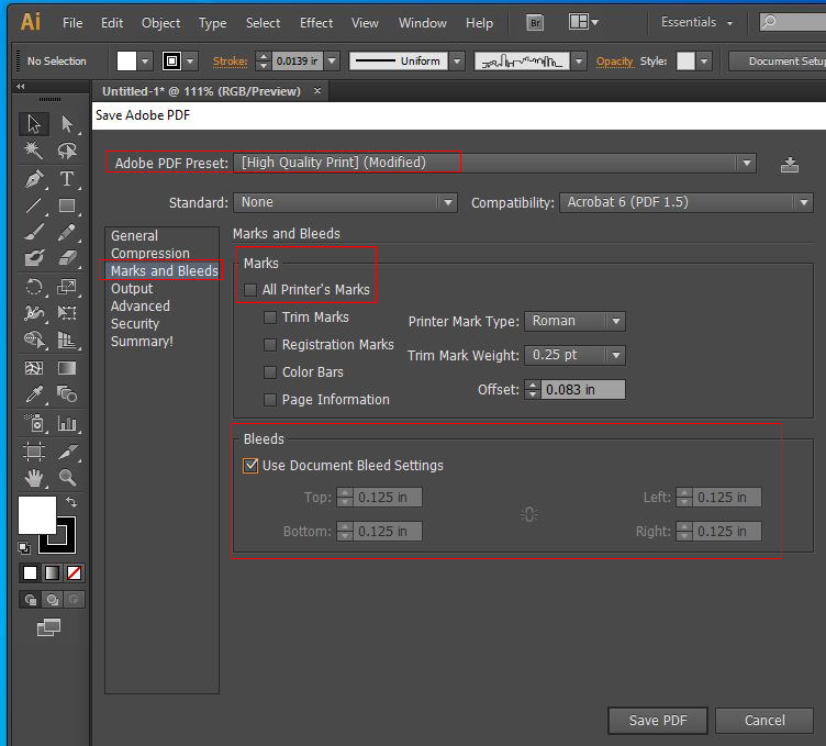 - Then on the left side click on Marks and Bleeds and uncheck All Printer’s Marks and check Bleeds Use Document Bleed Settings (make sure these are set to .125).