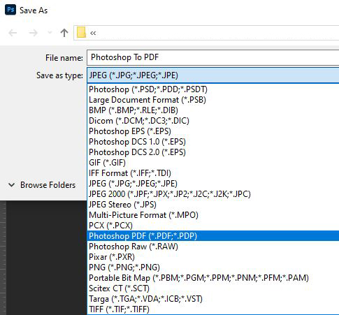 - Specify a name and location for the file. Then choose Photoshop PDF as the Save as type or File Type and click save.