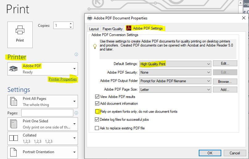 - Select “Adobe PDF” as the printer and click on Printer Properties.
