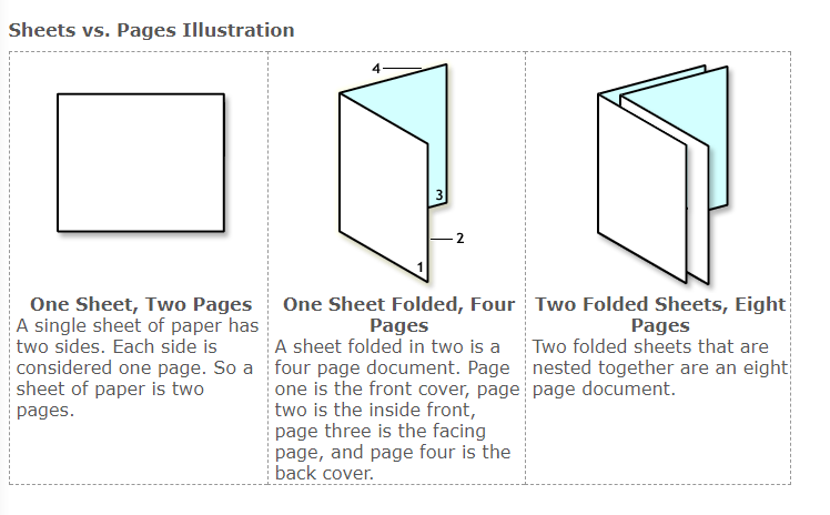 A single sheet of paper has 2 sides, a front and a back side. A sheet folded in half gives you 4 numbered pages.